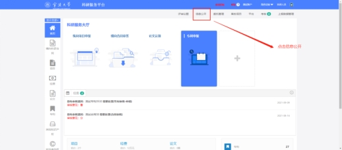 1.项目由管理员下发,进入待公开列表。科研人员登陆科研服务管理平台,点击右上角信息公开按钮,进入信息公开界面