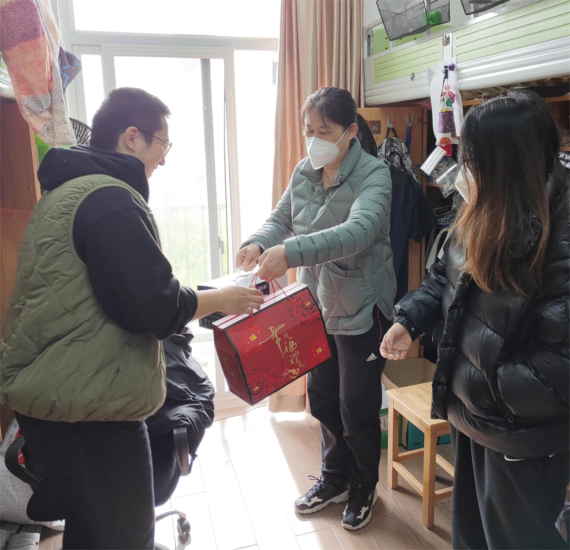 2023年1月9日,动漫屋 党委书记童莹娟、党委副书记胡秋丽、辅导员王鑫、陈英英一行人走访甬研公寓、南门公寓,看望慰问寒假留校学生,为其送上新春祝福,并且发放含牛奶、坚果在内的“新春”礼包。