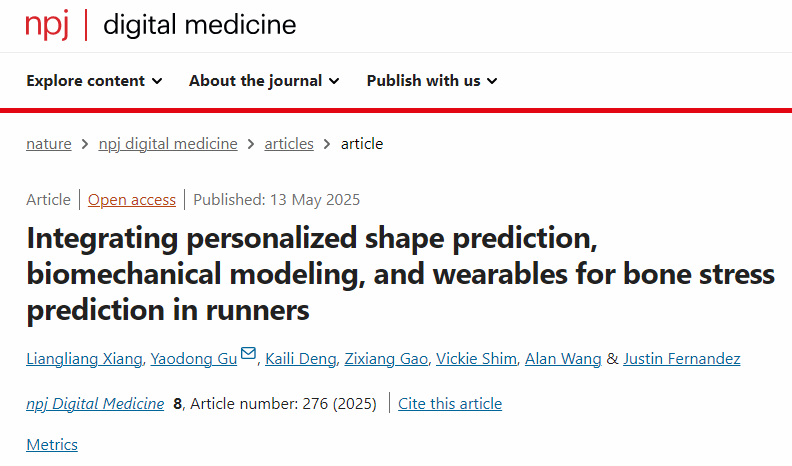 顾耀东教授团队联合瑞典皇家理工学院、新西兰奥克兰大学在Nature旗下顶尖期刊《npj Digital Medicine》(中科院医学一区Top期刊,影响因子12.4)上发表了题为《Integrating personalized shape prediction, biomechanical modeling, and wearables for bone stress prediction in runners》的研究论文。这是本研究团队在运动医学与数字健康交叉领域取得的重要进展,研究融合个性化骨骼形态预测、生物力学建模与可穿戴设备实现跑步者骨应力动态监测。顾耀东教授为论文唯一通讯作者,第一作者相亮亮博士毕业于动漫屋